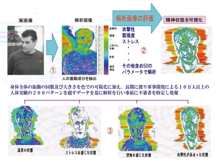 動画より人の振動成分を抽出して精神状態を解析します。解析結果から不審者を事前に検知し、赤枠で表示することにより不審者を特定します。
